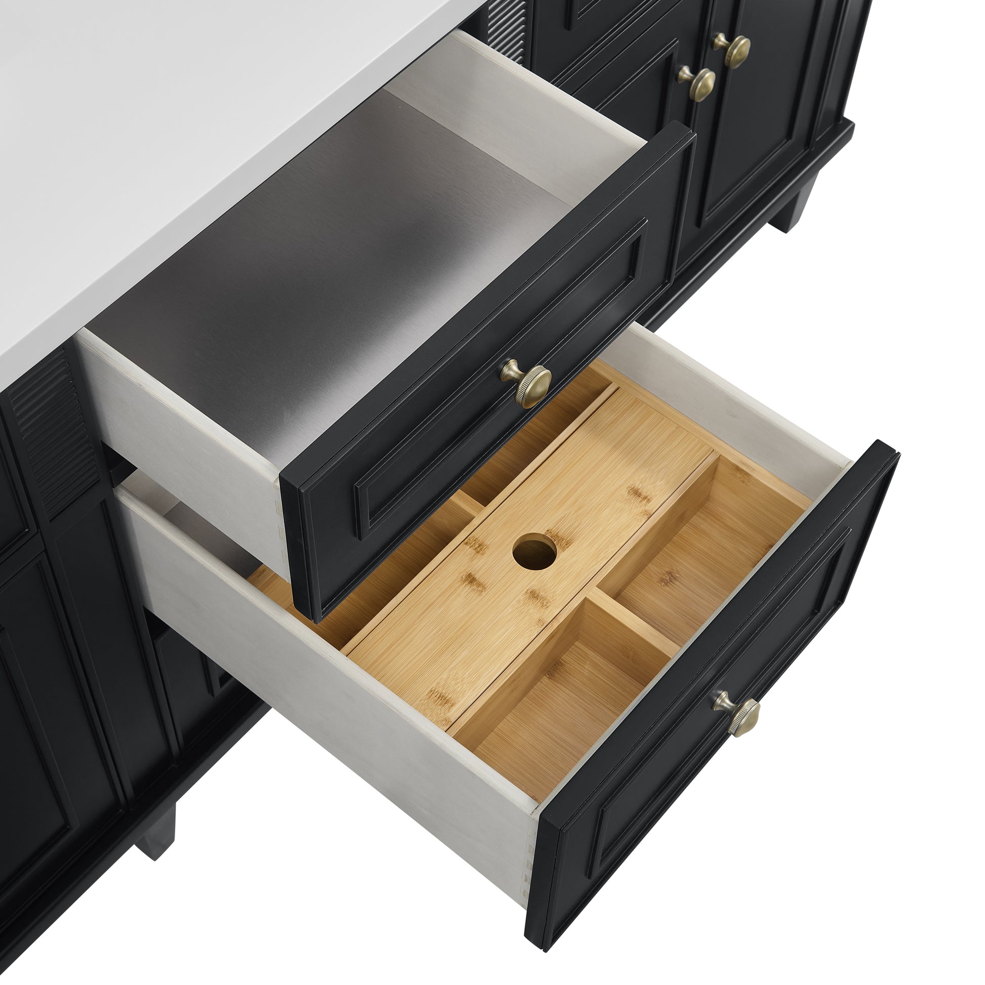 • Drawer boxes feature English Dovetail joinery, premium undermount softclose glides, and brushed aluminum laminate drawer liners for easy cleaning