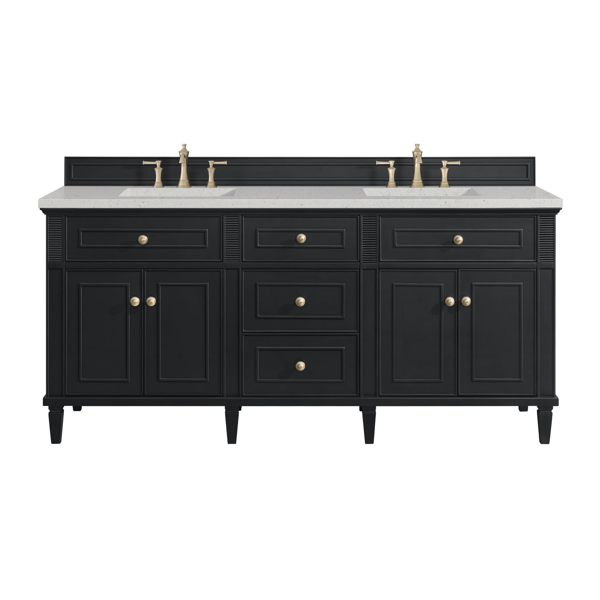 The 72" Lorelai Double Vanity celebrates timeless form and exquisite finish details, combined with practical function. The rich Black Onyx finish is accented by coin-edge knobs in Champagne Brass which provides an sophisticated contrast. Reeded details, and clean, and raised picture frame molding lend visual interest. This four-door cabinet opens to spacious interior with shelves and convenient USB/Electric power outlets. 3 traditional drawers and 2 tip-out The Lime Delight Silestone top lends warm, textured beige tones to perfectly complement the dark finish on the vanity.