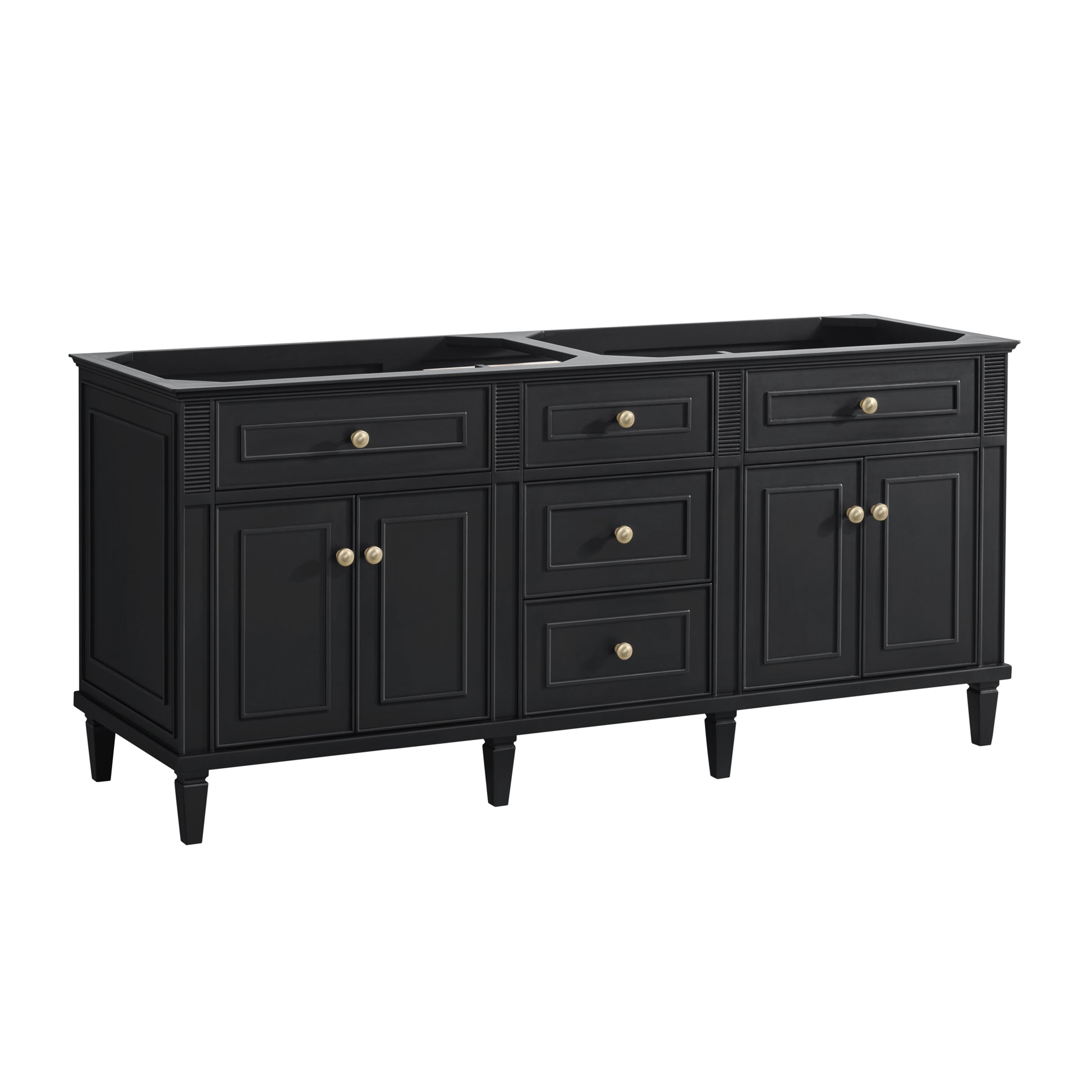 The 72" Lorelai Double Vanity celebrates timeless form and exquisite finish details, combined with practical function. The rich Black Onyx finish is accented by coin-edge knobs in Champagne Brass which provides an sophisticated contrast. Reeded details, and clean, and raised picture frame molding lend visual interest. This four-door cabinet opens to spacious interior with shelves and convenient USB/Electric power outlets. Three traditional drawers and two tip-outs offer additional storage space. With the addition of a classic White Zeus Silestone top and undermount sink, this vanity is a seamless integration of modern design and functionality.