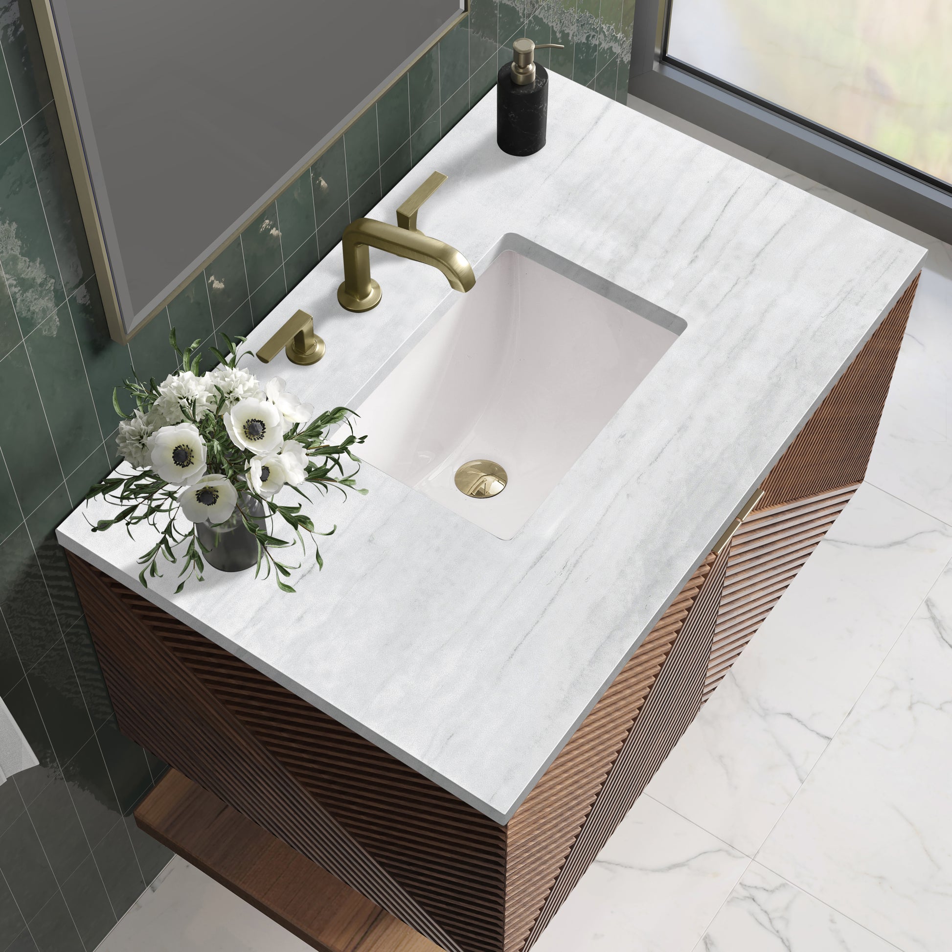 The 36" Marcello wall-mounted vanity adds a touch of mid-century modern charm to your bathroom, while the warm Chestnut finish provides timeless elegance. The reeded, patterned detail on the door fronts continues around the sides in geometric perfection. Crafted from solid Acacia, with rich, resawn Acacia veneer over Marine MDF, accented by sleek, tab-style door pulls in Champagne Brass. The wide, spacious interior drawer is framed on the top by a generous shelf and features our signature aluminum laminate liners and full extension, soft-close undermount glides. A floating shelf, mounted separately, adds a modern and visually balanced storage solution. The wall-hanging feature contemporizes the look with an easy-to"stall bracket system included. The 3 CM countertop, pre-drilled for an 8" widespread faucet, includes mounting hardware for the porcelain undermount sink. Adding an elegant contrast to the rich wood with Champagne Brass hardware, the 3 cm solid surface Arctic Fall vanity top displays horizontal grey veining giving you the look of expensive marble without the cost.