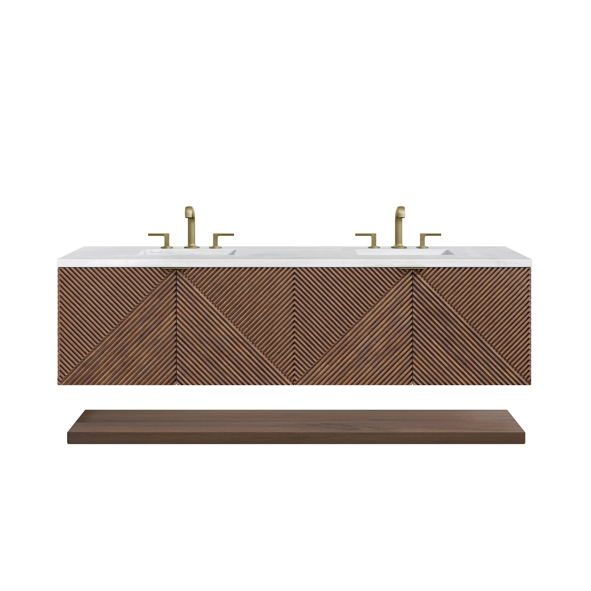 The 72" Marcello wall-mounted vanity adds a touch of mid-century modern charm to your bathroom, while the warm Chestnut finish gives it a timeless elegance. The reeded, patterned detail on the door fronts continues around the sides in geometric perfection. Crafted from solid Acacia, with rich, resawn Acacia veneer over Marine MDF, accented by sleek, tab-style door pulls in Champagne Brass. Two spacious interior drawers are framed on the top by a generous shelf and feature our signature aluminum laminate liners and full extension, soft-close undermount glides. A floating shelf, mounted separately, adds a modern and visually balanced storage solution. The wall-hanging feature contemporizes the look with an easy-to"stall bracket system included. The 3 CM countertop, pre-drilled for an 8" widespread faucet, includes mounting hardware for the porcelain undermount sink. Adding an elegant contrast to the rich wood with Champagne Brass hardware, the 3 cm solid surface Arctic Fall vanity top displays horizontal grey veining giving you the look of expensive marble without the cost.