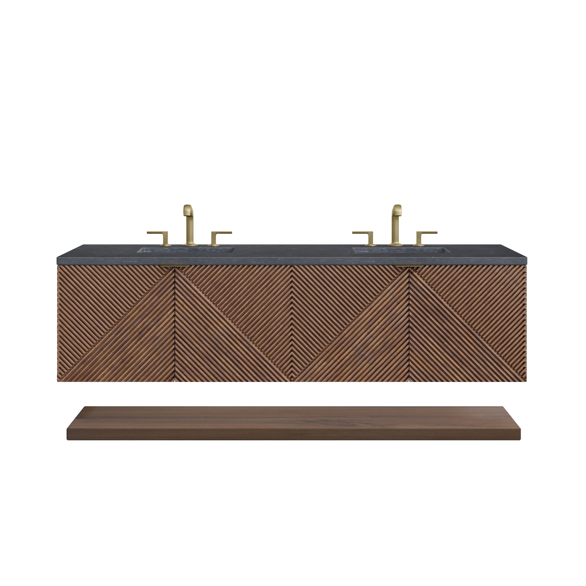 The 72" Marcello wall-mounted vanity adds a touch of mid-century modern charm to your bathroom, while the warm Chestnut finish gives it a timeless elegance. The reeded, patterned detail on the door fronts continues around the sides in geometric perfection. Crafted from solid Acacia, with rich, resawn Acacia veneer over Marine MDF, accented by sleek, tab-style door pulls in Champagne Brass. Two spacious interior drawers are framed on the top by a generous shelf and feature our signature aluminum laminate liners and full extension, soft-close undermount glides. A floating shelf, mounted separately, adds a modern and visually balanced storage solution. The wall-hanging feature contemporizes the look with an easy-to"stall bracket system included. The 3 CM countertop, pre-drilled for an 8" widespread faucet, includes mounting hardware for the porcelain undermount sink. A spectacular top characterized by depth and a sense of movement with a suede finish, the Charcoal Soapstone Silestone top by Cosentino has the new n-boost technology, which helps prevent the adhesion of liquids, enhances shine, and intensifies the color of this top.