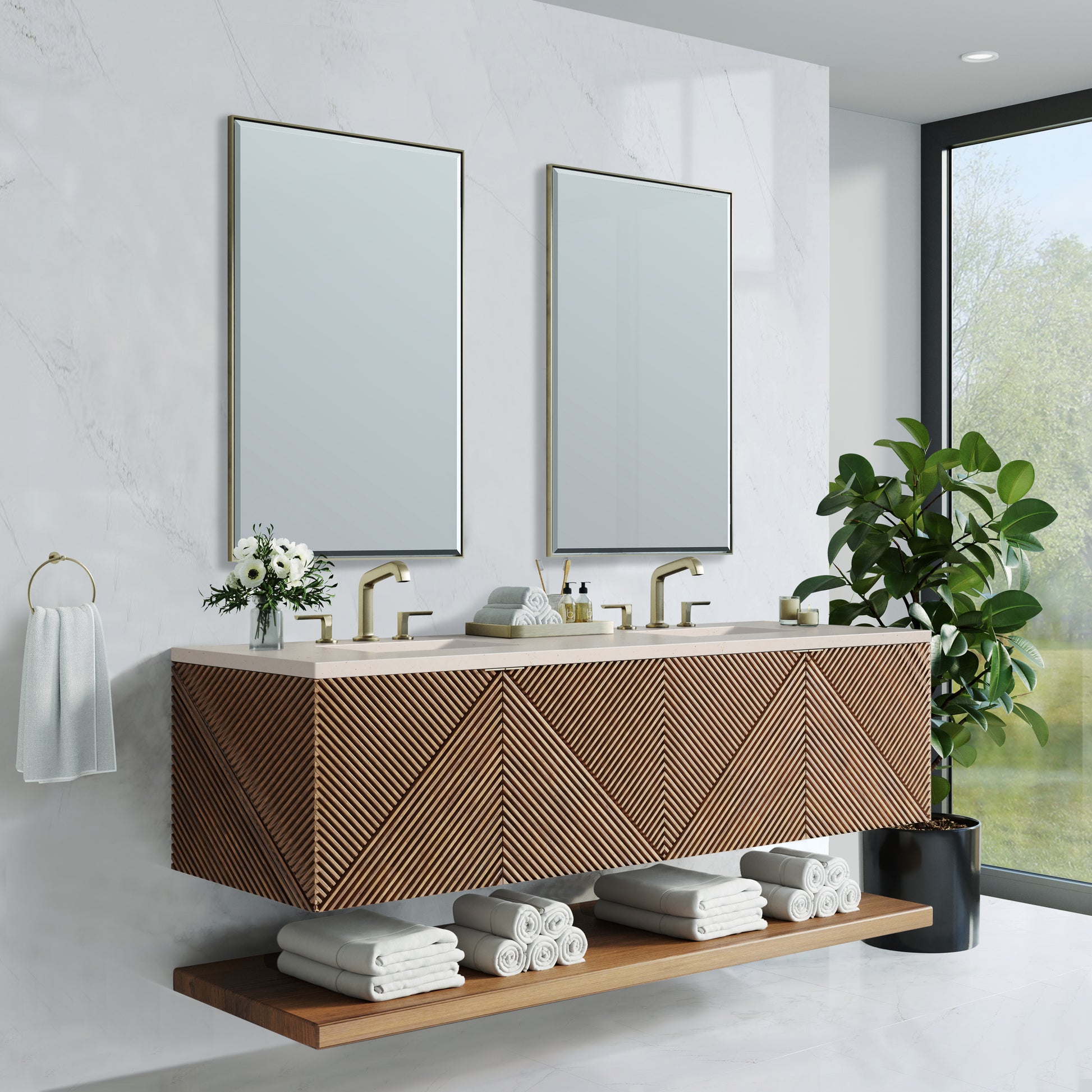 The 72" Marcello wall-mounted vanity adds a touch of mid-century modern charm to your bathroom, while the warm Chestnut finish gives it a timeless elegance. The reeded, patterned detail on the door fronts continues around the sides in geometric perfection. Crafted from solid Acacia, with rich, resawn Acacia veneer over Marine MDF, accented by sleek, tab-style door pulls in Champagne Brass. Two spacious interior drawers are framed on the top by a generous shelf and feature our signature aluminum laminate liners and full extension, soft-close undermount glides. A floating shelf, mounted separately, adds a modern and visually balanced storage solution. The wall-hanging feature contemporizes the look with an easy-to"stall bracket system included. The 3 CM countertop, pre-drilled for an 8" widespread faucet, includes mounting hardware for the porcelain undermount sink. The classic, warm tones of the Eternal Marfil Silestone top by Cosentino provide an elegant, tonal contrast to the modern Chestnut finish.