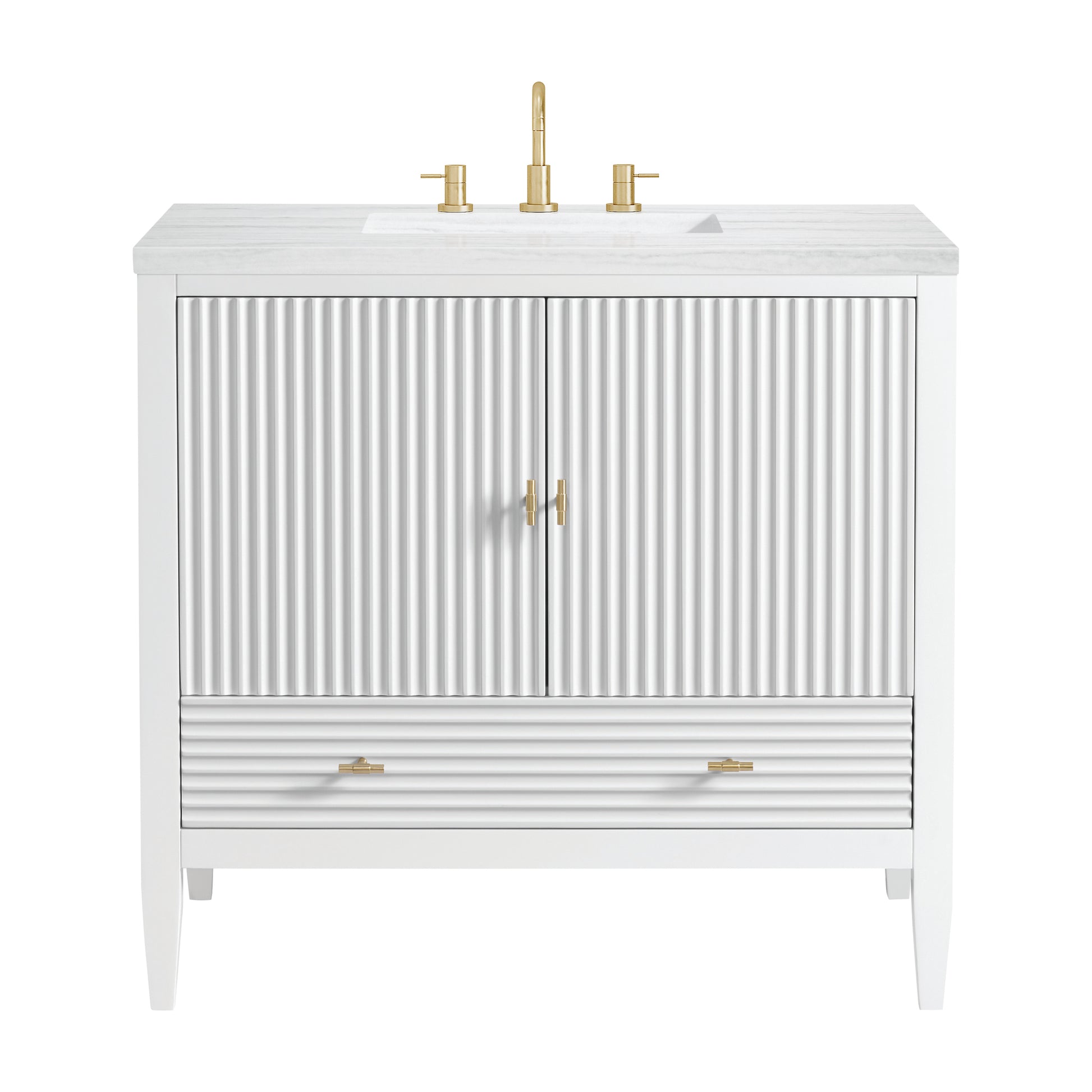The 36" Myrrin Single Vanity features a minimalistic silhouette with fluted details, resulting in a blend of classical elegance and contemporary design. The deeply fluted panels run perpendicular on the doors and drawers, adding sophistication and visual interest to the design. Toggle-style knobs in Champagne Brass provide a luxe accent to the rich Bright White finish. The two-door cabinet opens to a spacious interior with a single shelf and a convenient USB/Electric power outlet. A single, lower-level drawer lends additional storage. Completing this beautiful vanity is a 3 cm solid surface Arctic Fall vanity top, which displays horizontal grey veining, giving you the look of classic marble with the benefits of modern technology.