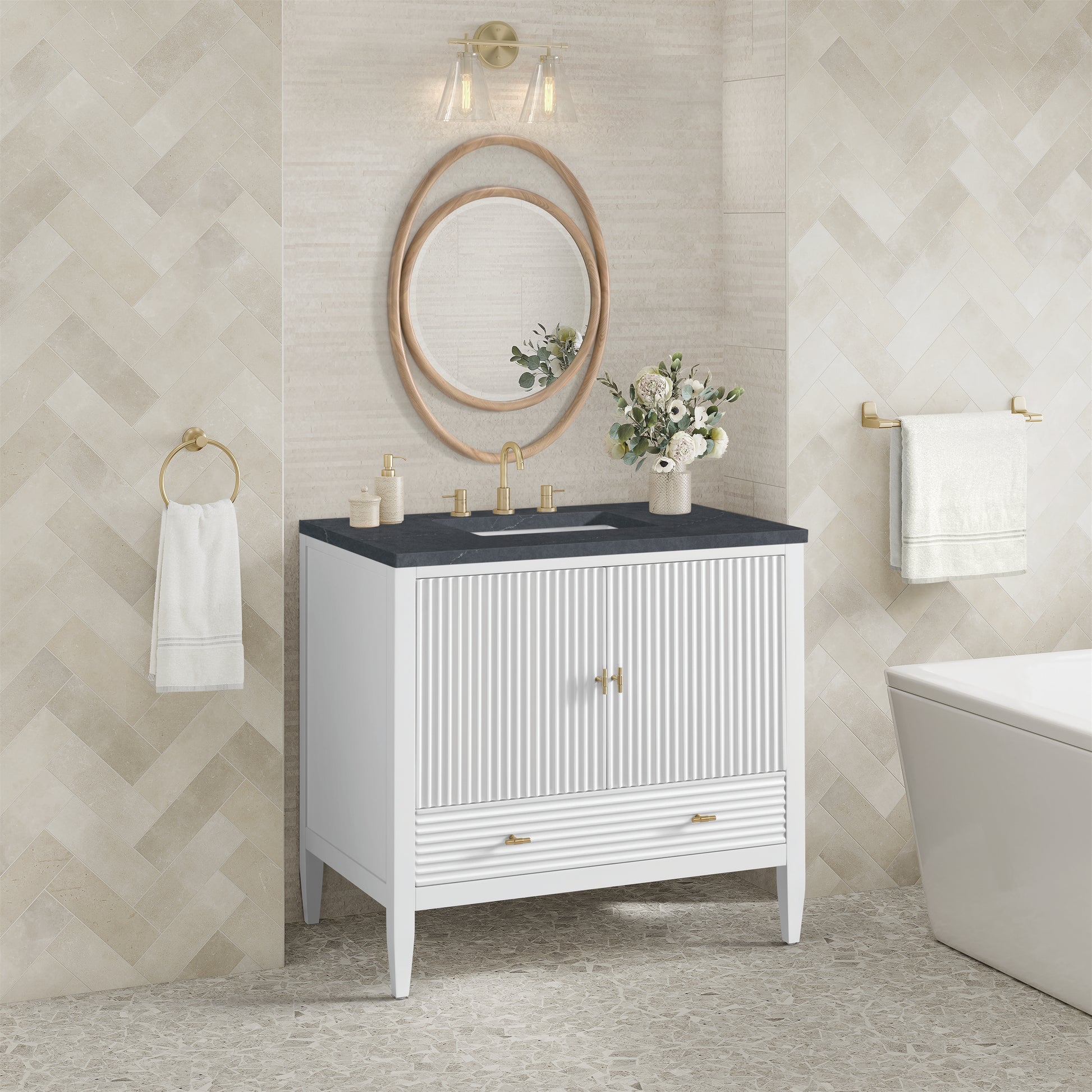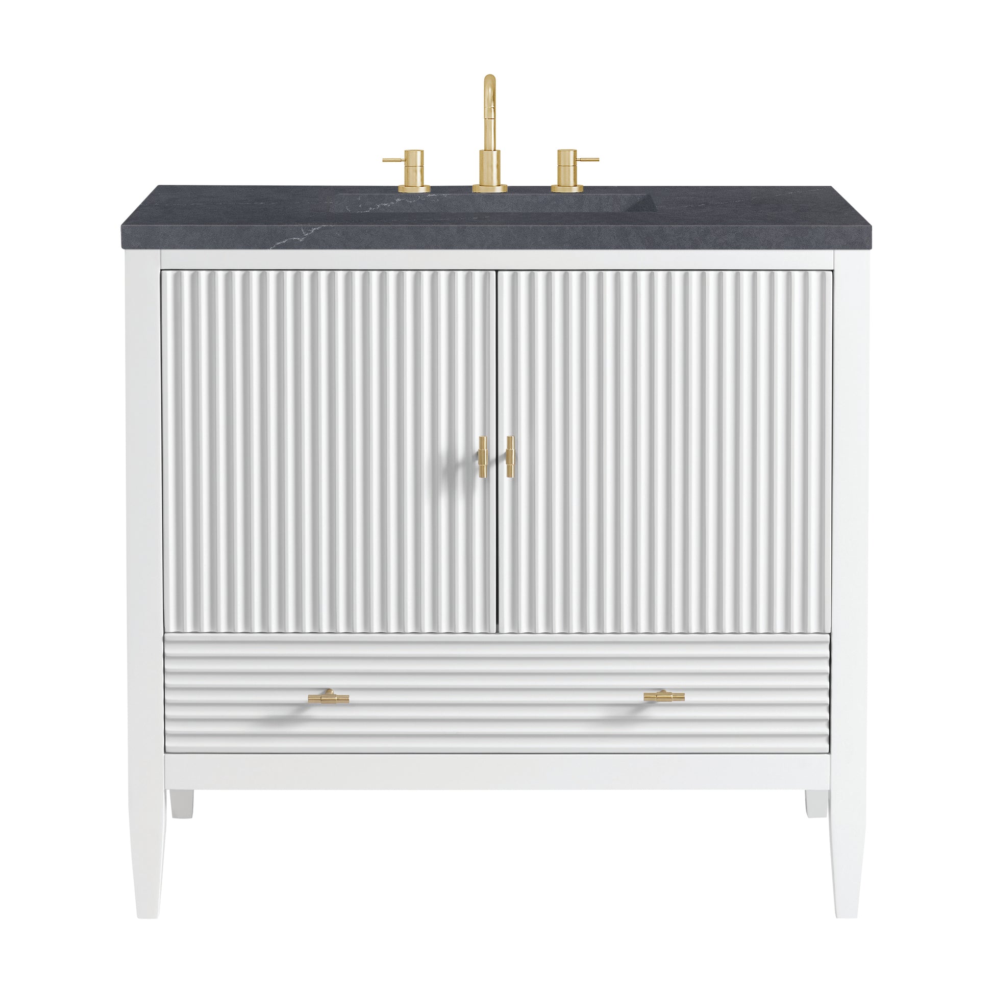 The 36" Myrrin Single Vanity features a minimalistic silhouette with fluted details, resulting in a blend of classical elegance and contemporary design. The deeply fluted panels run perpendicular on the doors and drawers, adding sophistication and visual interest to the design. Toggle-style knobs in Champagne Brass provide a luxe accent to the rich Bright White finish. The two-door cabinet opens to a spacious interior with a single shelf and a convenient USB/Electric power outlet. A single, lower-level drawer lends additional storage. Completing this piece is a distinguished top, characterized by depth and a sense of movement with a suede finish. The Charcoal Soapstone Silestone top by Cosentino has the new n-boost technology, which helps prevent the adhesion of liquids, enhances shine, and intensifies the color of this top.