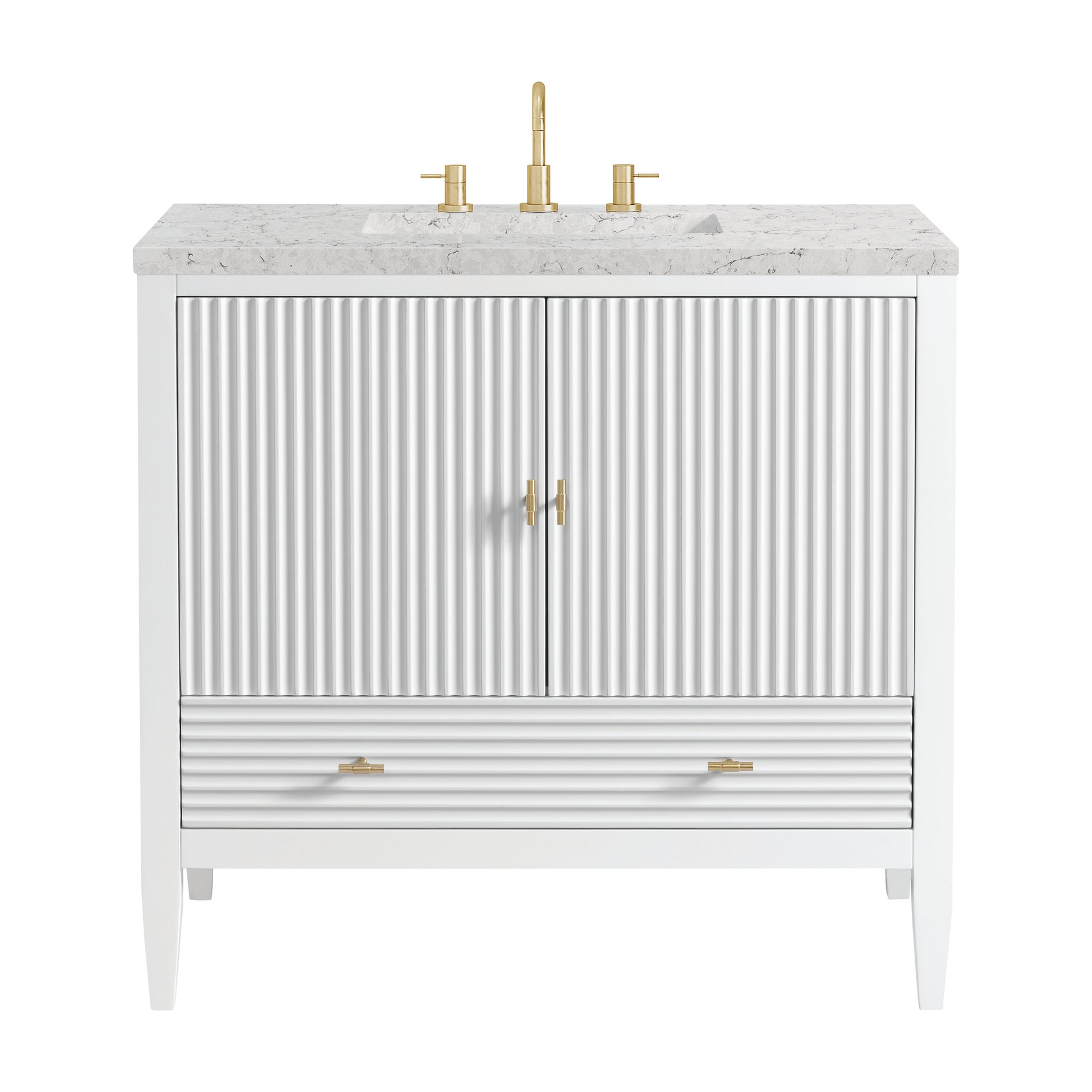 The 36" Myrrin Single Vanity features a minimalistic silhouette with fluted details, resulting in a blend of classical elegance and contemporary design. The deeply fluted panels run perpendicular on the doors and drawers, adding sophistication and visual interest to the design. Toggle-style knobs in Champagne Brass provide a luxe accent to the rich Bright White finish. The two-door cabinet opens to a spacious interior with a single shelf and a convenient USB/Electric power outlet. A single, lower-level drawer lends additional storage. Completing the look is the Eternal Jasmine Pearl Silestone top by Cosentino, featuring an elegant white background with subtle marbleized swirls and dark blue-gray veining patterns.