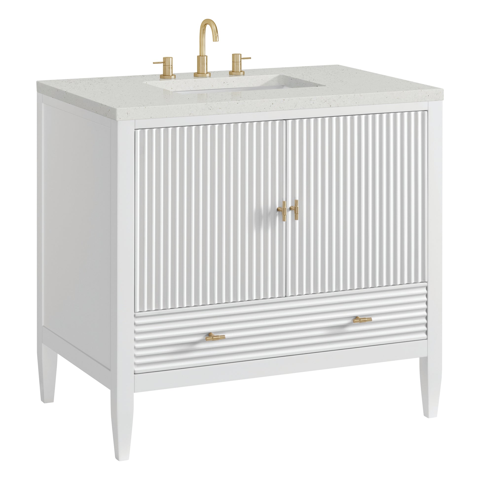 The 36" Myrrin Single Vanity features a minimalistic silhouette with fluted details, resulting in a blend of classical elegance and contemporary design. The deeply fluted panels run perpendicular on the doors and drawers, adding sophistication and visual interest to the design. Toggle-style knobs in Champagne Brass provide a luxe accent to the rich Bright White finish. The two-door cabinet opens to a spacious interior with a single shelf and a convenient USB/Electric power outlet. A single, lower-level drawer lends additional storage. The Lime Delight Silestone top lends warm, textured beige tones to perfectly complement the finish on the vanity.