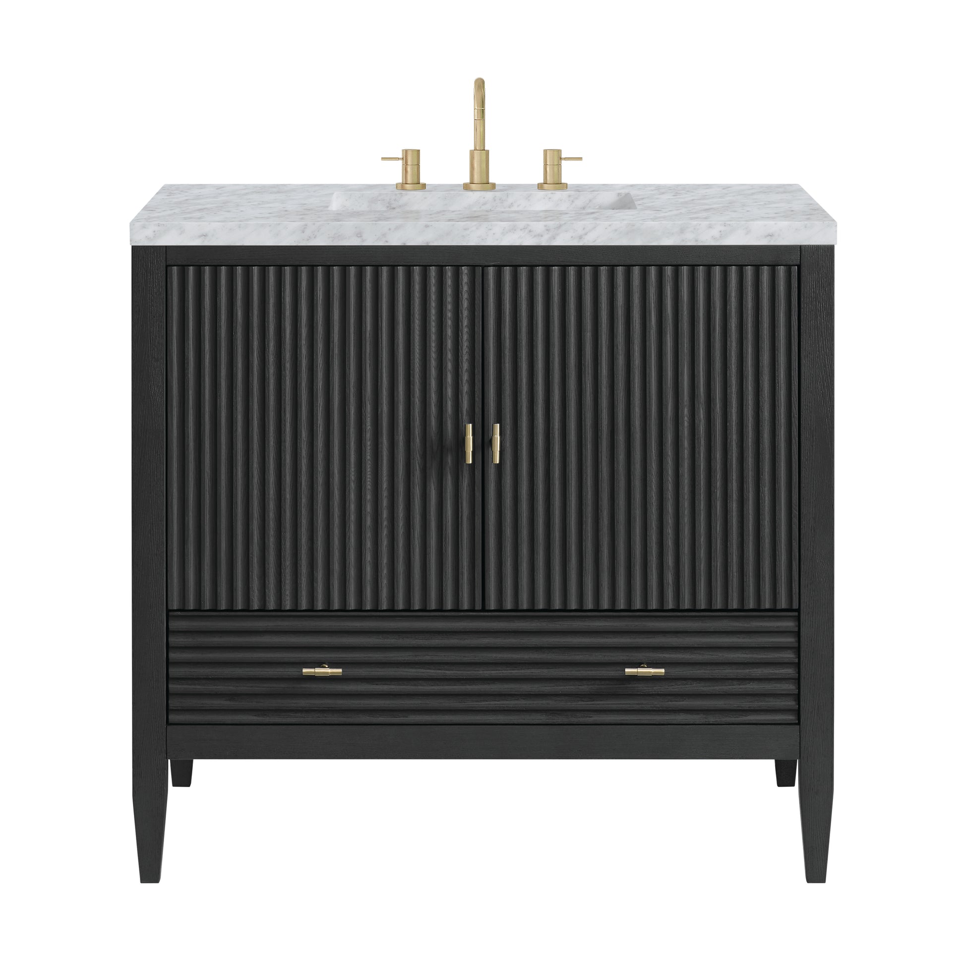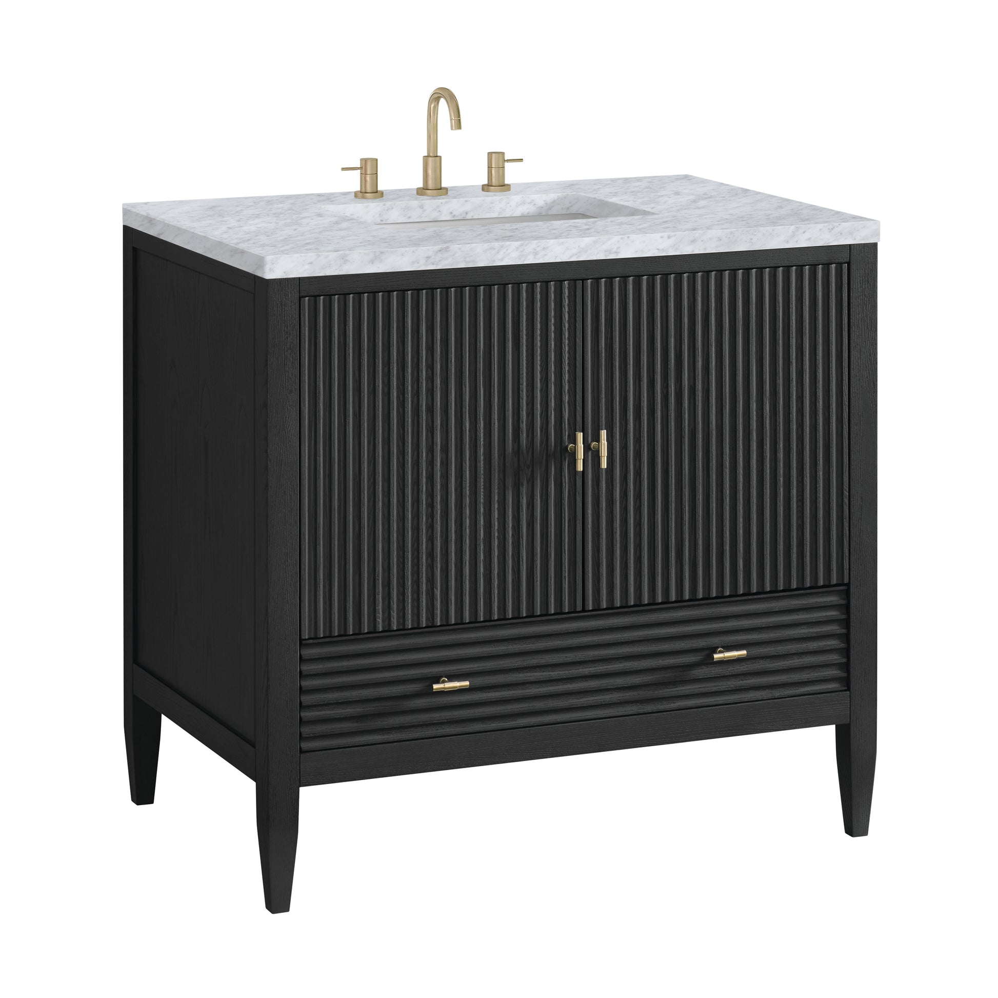 The 36" Myrrin Single Vanity features a minimalistic silhouette with fluted details, resulting in a blend of classical elegance and contemporary design. The deeply fluted panels run perpendicular on the doors and drawers, adding sophistication and visual interest to the design. Toggle-style knobs in Champagne Brass provide a luxe accent to the sophisticated Carbon Oak finish. The two-door cabinet opens to a spacious interior with a single shelf and a convenient USB/Electric power outlet. A single, lower-level drawer lends additional storage. Completing this vanity, are the treasured, neutral tones and textures of the Carrara marble vanity top display an white background with delicate grey veining.