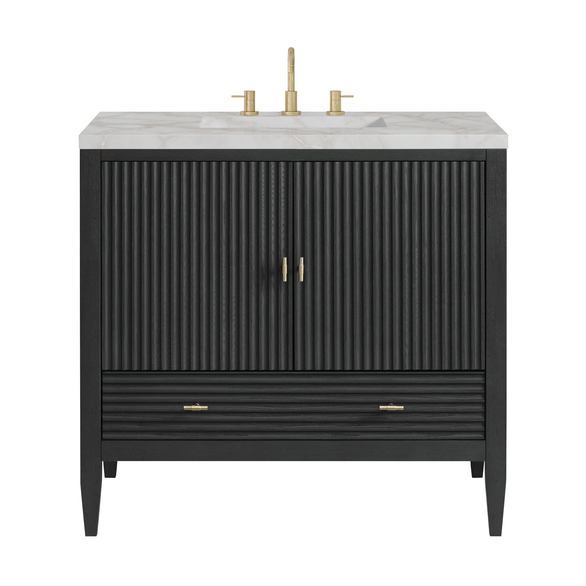 The 36" Myrrin Single Vanity features a minimalistic silhouette with fluted details, resulting in a blend of classical elegance and contemporary design. The deeply fluted panels run perpendicular on the doors and drawers, adding sophistication and visual interest to the design. Toggle-style knobs in Champagne Brass provide a luxe accent to the sophisticated Carbon Oak finish. The two-door cabinet opens to a spacious interior with a single shelf and a convenient USB/Electric power outlet. A single, lower-level drawer lends additional storage. The finish is accented by the neutral background of the Victorian Silver Silestone top, boasting champagne metallic accents which seamlessly complete the look.