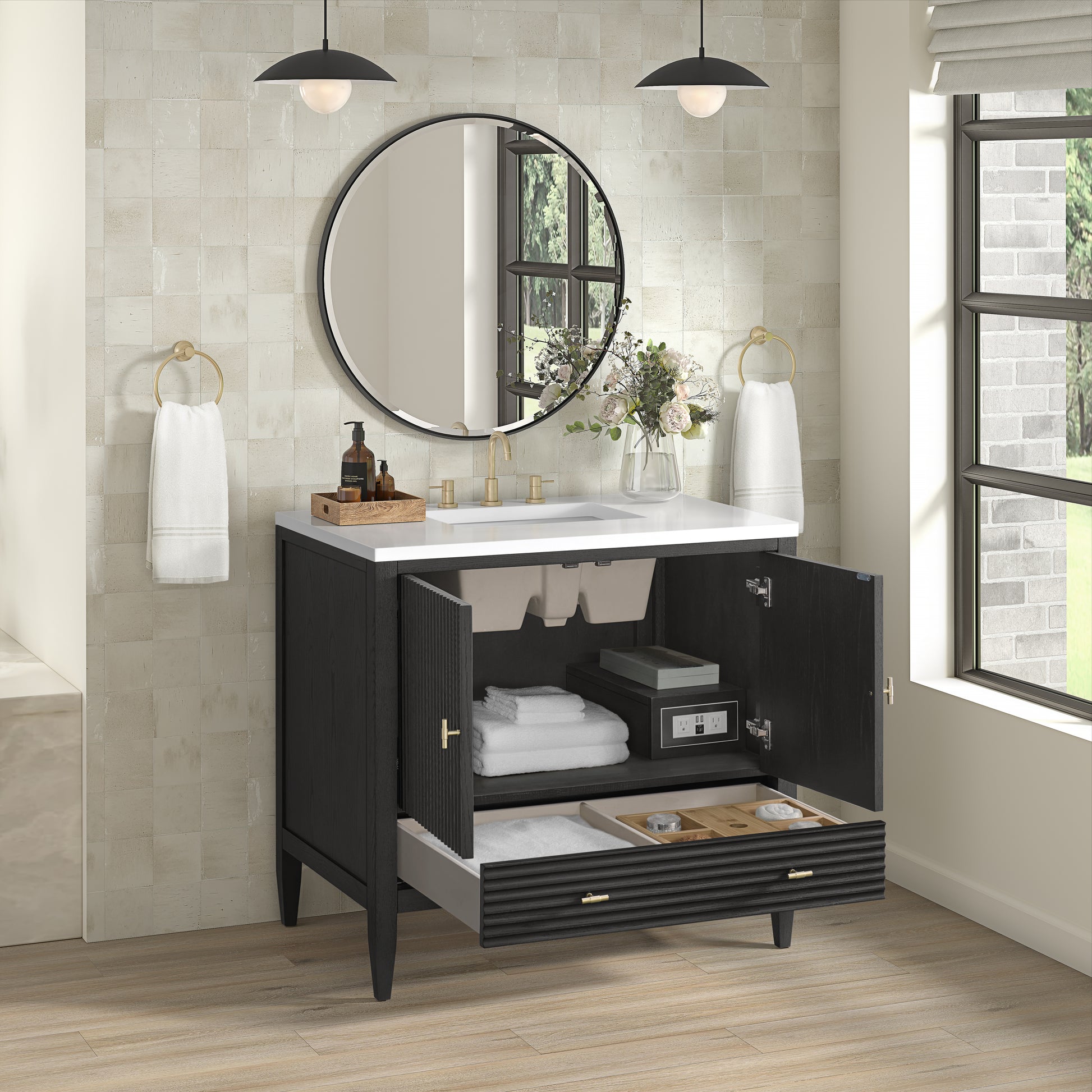 The 36" Myrrin Single Vanity features a minimalistic silhouette with fluted details, resulting in a blend of classical elegance and contemporary design. The deeply fluted panels run perpendicular on the doors and drawers, adding sophistication and visual interest to the design. Toggle-style knobs in Champagne Brass provide a luxe accent to the sophisticated Carbon Oak finish. The two-door cabinet opens to a spacious interior with a single shelf and a convenient USB/Electric power outlet. A single, lower-level drawer lends additional storage. With the addition of a classic White Zeus Silestone top and undermount sink, this vanity is a seamless integration of modern design and functionality.