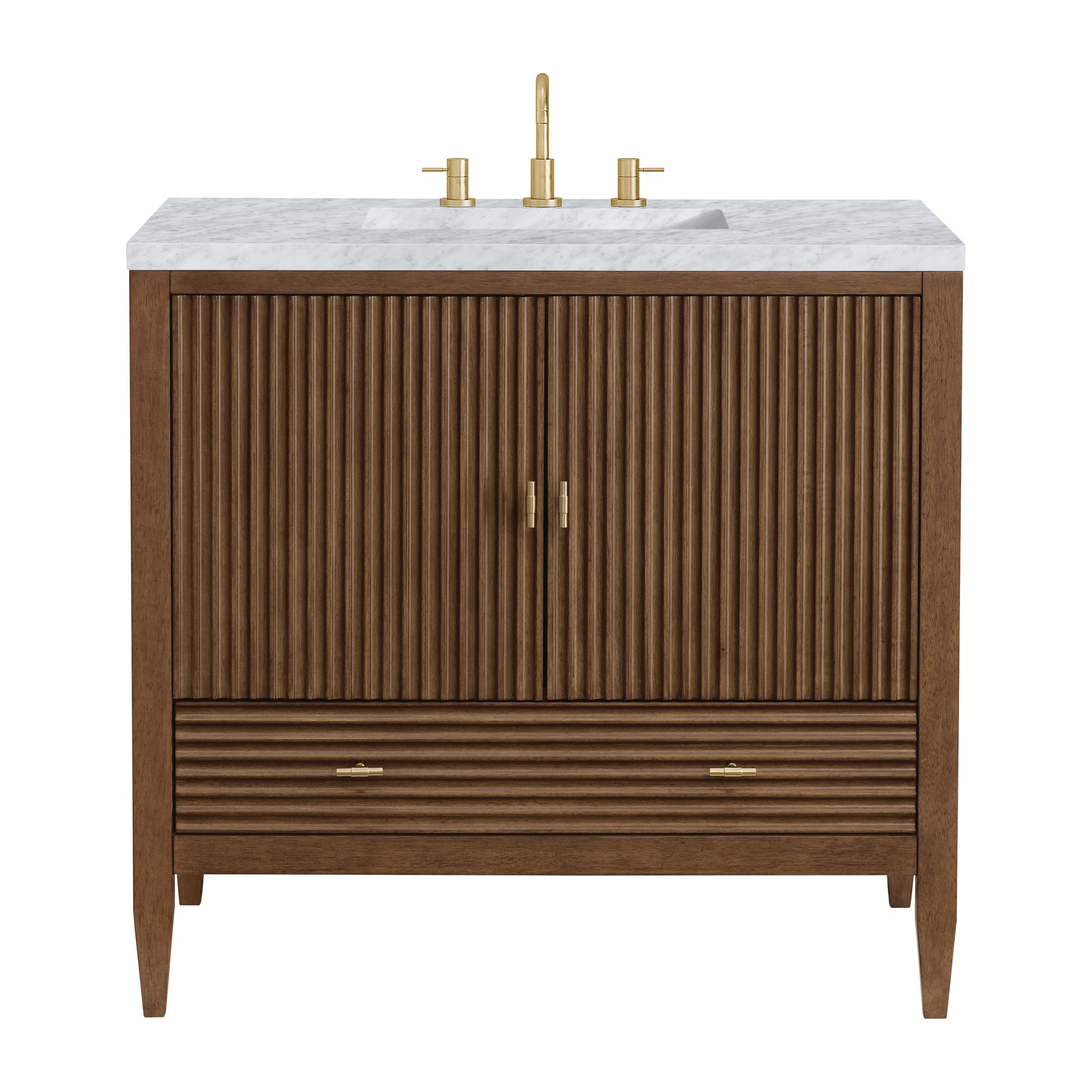 The 36" Myrrin Single Vanity features a minimalistic silhouette with fluted details, resulting in a blend of classical elegance and contemporary design. The deeply fluted panels run perpendicular on the doors and drawers, adding sophistication and visual interest to the design. Toggle-style knobs in Champagne Brass provide a luxe accent to the rich Mid-Century Walnut finish. The two-door cabinet opens to a spacious interior with a single shelf and a convenient USB/Electric power outlet. A single, lower-level drawer lends additional storage. Completing this vanity, are the treasured, neutral tones and textures of the Carrara marble vanity top display an white background with delicate grey veining.