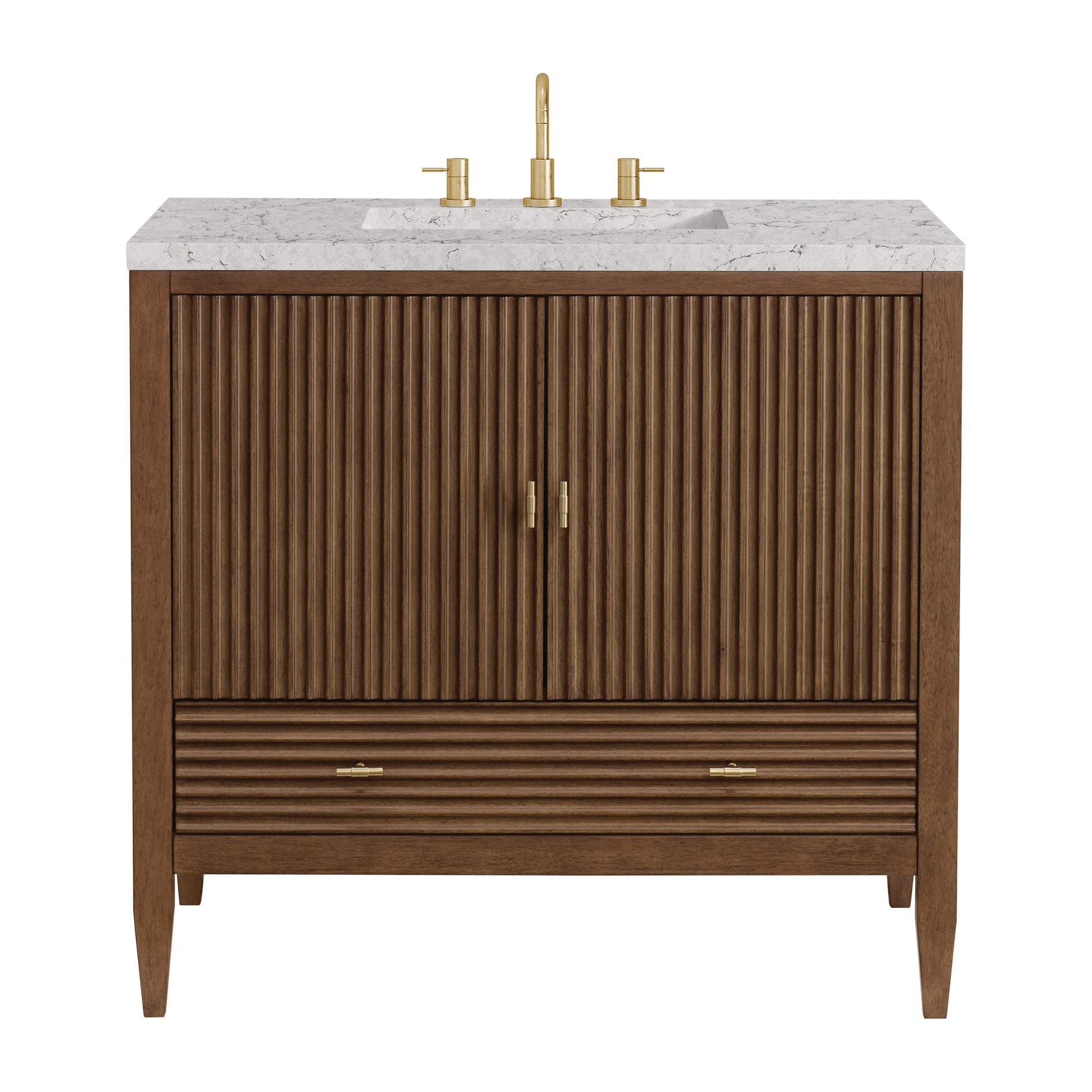 The 36" Myrrin Single Vanity features a minimalistic silhouette with fluted details, resulting in a blend of classical elegance and contemporary design. The deeply fluted panels run perpendicular on the doors and drawers, adding sophistication and visual interest to the design. Toggle-style knobs in Champagne Brass provide a luxe accent to the rich Mid-Century Walnut finish. The two-door cabinet opens to a spacious interior with a single shelf and a convenient USB/Electric power outlet. A single, lower-level drawer lends additional storage. Completing the look is the Eternal Jasmine Pearl Silestone top by Cosentino, featuring an elegant white background with subtle marbleized swirls and dark blue-gray veining patterns.