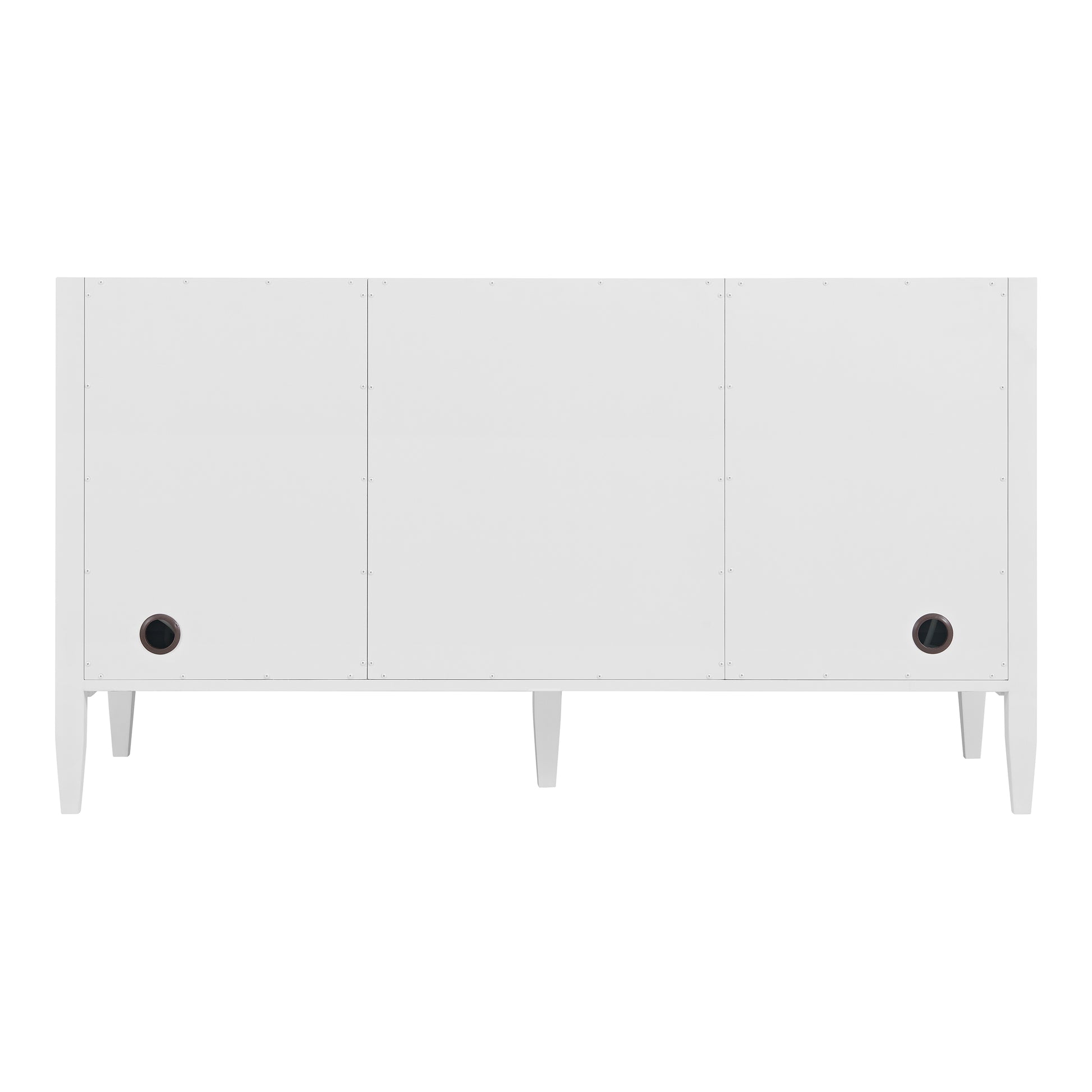 The 60" Myrrin Double Vanity features a minimalistic silhouette with fluted details, resulting in a blend of classical elegance and contemporary design. The deeply fluted panels run perpendicular on the doors and drawers, adding sophistication and visual interest to the design. Toggle-style knobs in Champagne Brass provide a luxe accent to the rich Bright White finish. The two-door cabinet opens to a spacious interior with a single shelf and a convenient USB/Electric power outlet. Two traditional drawers and a tip-out lend additional storage. Completing the look is the Eternal Jasmine Pearl Silestone top by Cosentino, featuring an elegant white background with subtle marbleized swirls and dark blue-gray veining patterns.