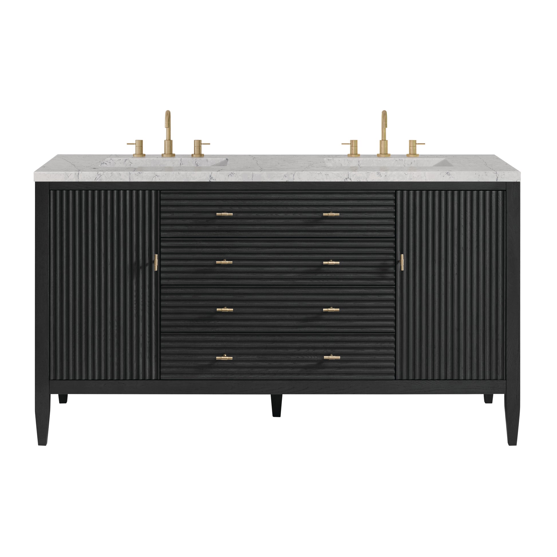 The 60" Myrrin Double Vanity features a minimalistic silhouette with fluted details, resulting in a blend of classical elegance and contemporary design. The deeply fluted panels run perpendicular on the doors and drawers, adding sophistication and visual interest to the design. Toggle-style knobs in Champagne Brass provide a luxe accent to the sophisticated Carbon Oak finish. The two-door cabinet opens to a spacious interior with a single shelf and a convenient USB/Electric power outlet. Two traditional drawers and a tip-out lend additional storage. Completing the look is the Eternal Jasmine Pearl Silestone top by Cosentino, featuring an elegant white background with subtle marbleized swirls and dark blue-gray veining patterns.