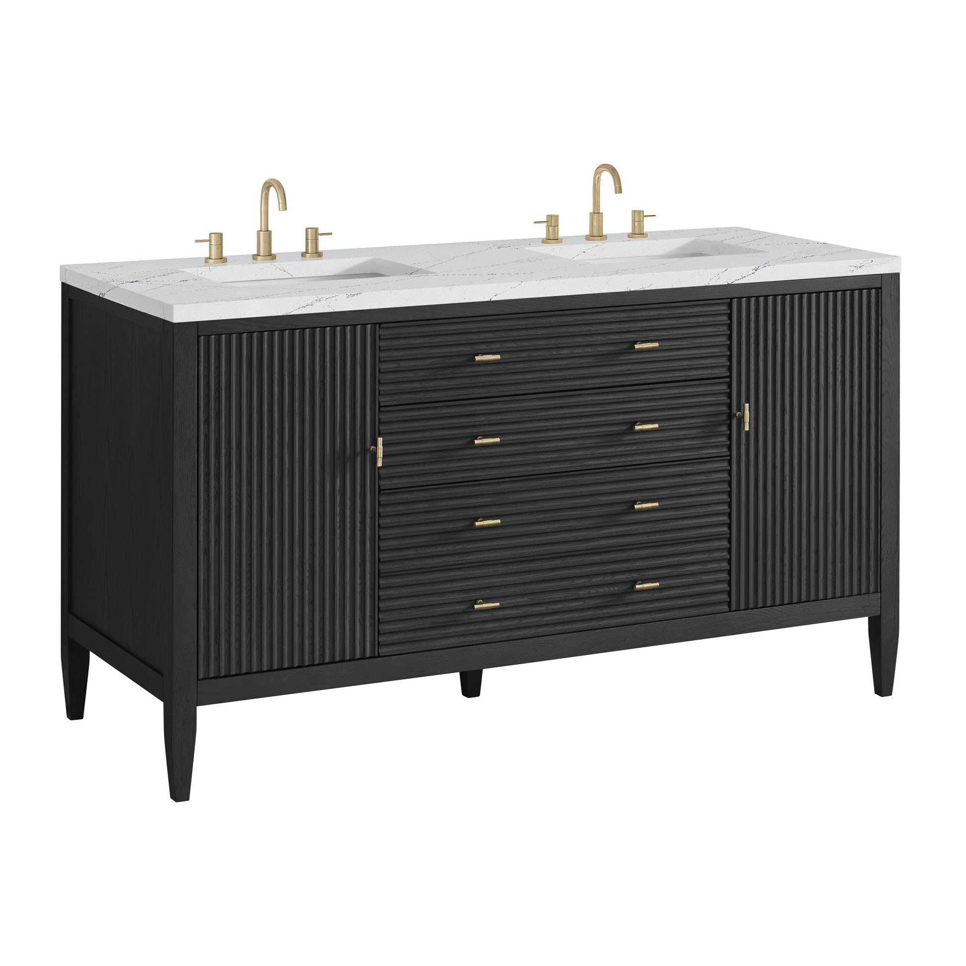 The 60" Myrrin Double Vanity features a minimalistic silhouette with fluted details, resulting in a blend of classical elegance and contemporary design. The deeply fluted panels run perpendicular on the doors and drawers, adding sophistication and visual interest to the design. Toggle-style knobs in Champagne Brass provide a luxe accent to the sophisticated Carbon Oak finish. The two-door cabinet opens to a spacious interior with a single shelf and a convenient USB/Electric power outlet. Two traditional drawers and a tip-out lend additional storage. The addition of an Ethereal Noctis Silestone top by Cosentino with undermount rectangular sink completes this timeless bathroom centerpiece with its modern, intricate black and gray nuances which add contrast and elegance to the white background.