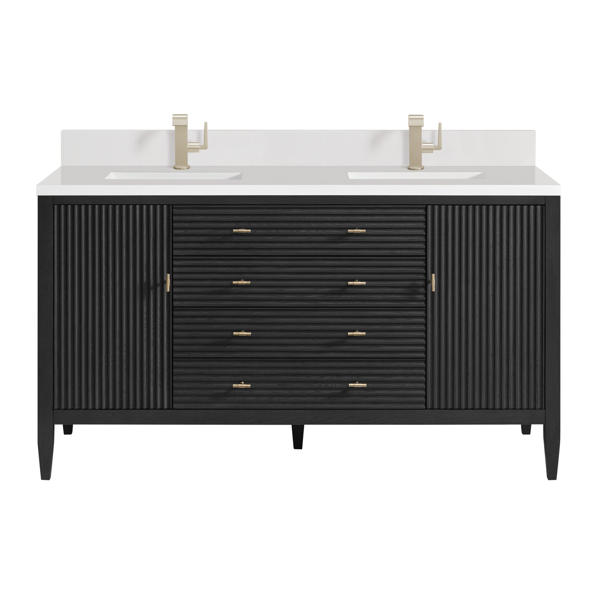 The 60" Myrrin Double Vanity features a minimalistic silhouette with fluted details, resulting in a blend of classical elegance and contemporary design. The deeply fluted panels run perpendicular on the doors and drawers, adding sophistication and visual interest to the design. Toggle-style knobs in Champagne Brass provide a luxe accent to the sophisticated Carbon Oak finish. The two-door cabinet opens to a spacious interior with a single shelf and a convenient USB/Electric power outlet. Two traditional drawers and a tip-out lend additional storage. With the addition of a classic White Zeus Silestone top with backsplash and undermount sink, this vanity is a seamless integration of modern design and functionality.
