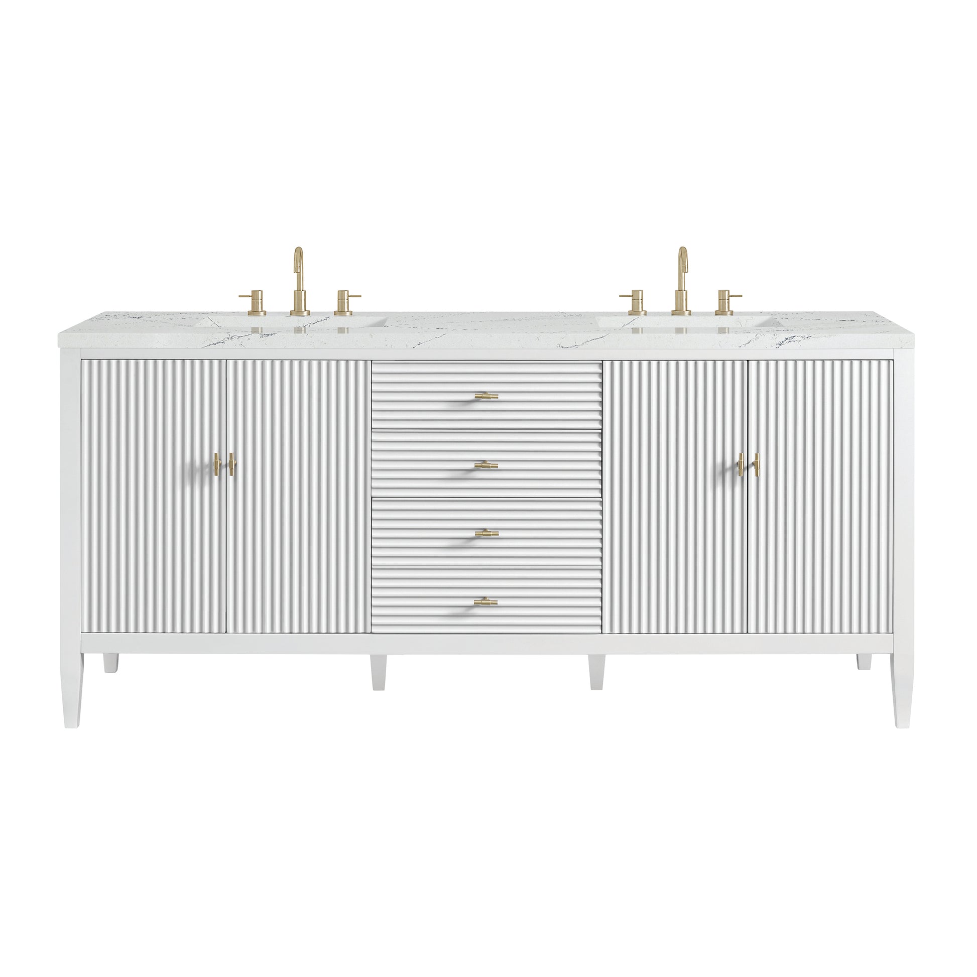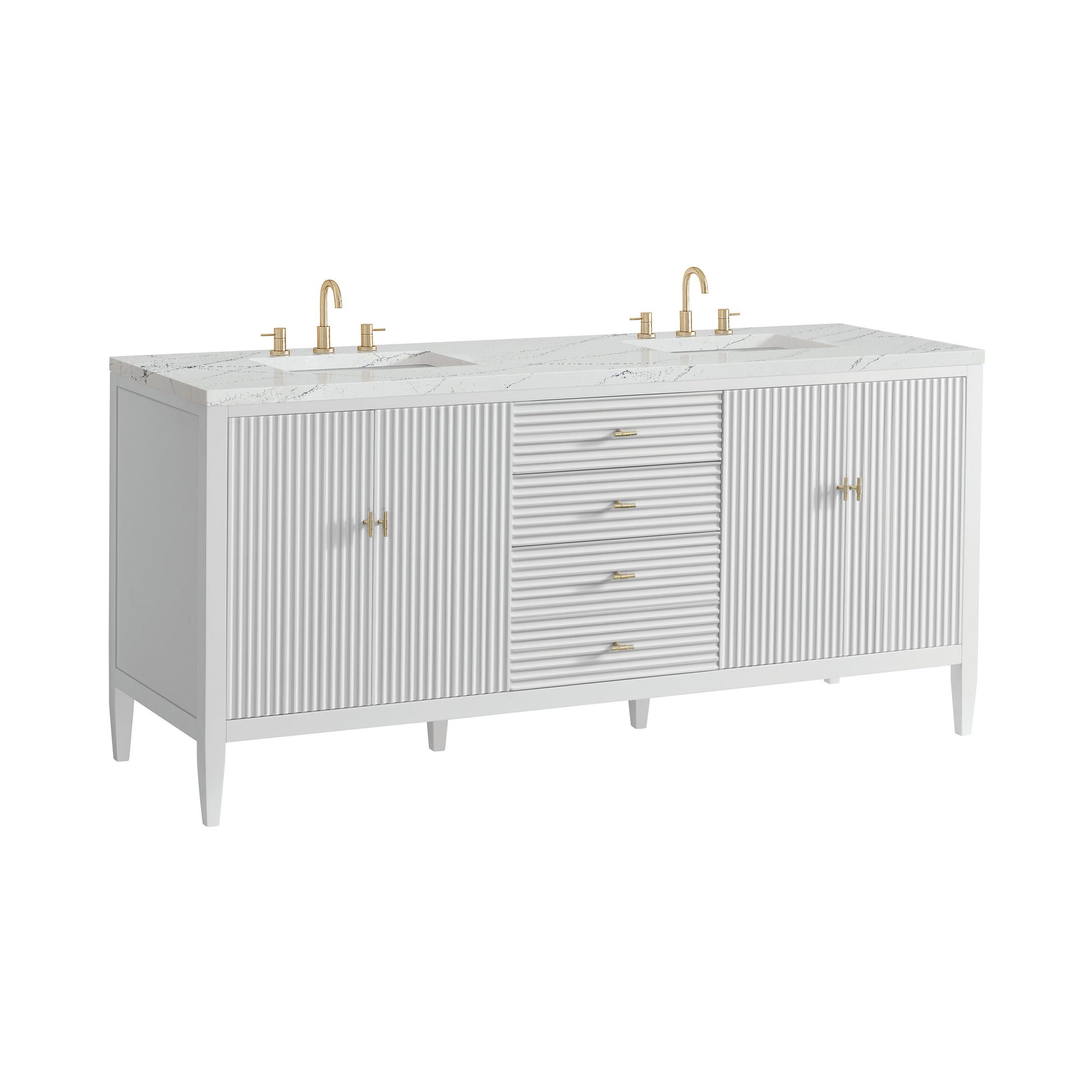 The 72" Myrrin Double Vanity features a minimalistic silhouette with fluted details, resulting in a blend of classical elegance and contemporary design. The deeply fluted panels run perpendicular on the doors and drawers, adding sophistication and visual interest to the design. Toggle-style knobs in Champagne Brass provide a luxe accent to the rich Bright White finish. The four-door cabinet opens to a spacious interior with a single shelf and convenient USB/Electric power outlets. Three drawers lend additional storage. The addition of an Ethereal Noctis Silestone top by Cosentino with undermount rectangular sink completes this timeless bathroom centerpiece with its modern, intricate black and gray nuances which add contrast and elegance to the white background.