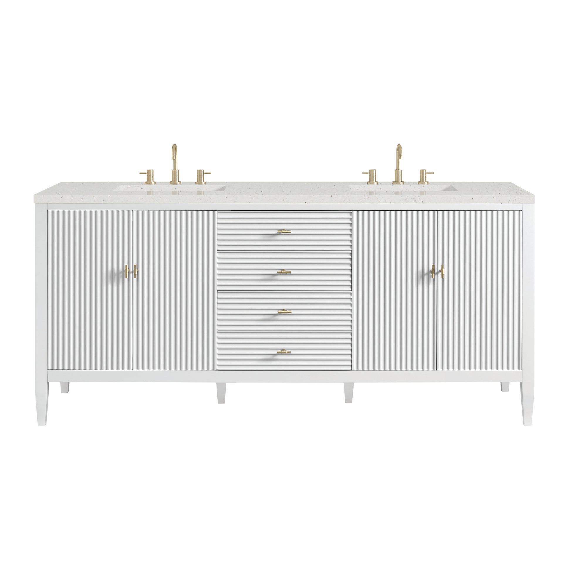 The 72" Myrrin Double Vanity features a minimalistic silhouette with fluted details, resulting in a blend of classical elegance and contemporary design. The deeply fluted panels run perpendicular on the doors and drawers, adding sophistication and visual interest to the design. Toggle-style knobs in Champagne Brass provide a luxe accent to the rich Bright White finish. The four-door cabinet opens to a spacious interior with a single shelf and convenient USB/Electric power outlets. Three drawers lend additional storage. The Lime Delight Silestone top lends warm, textured beige tones to perfectly complement the finish on the vanity.