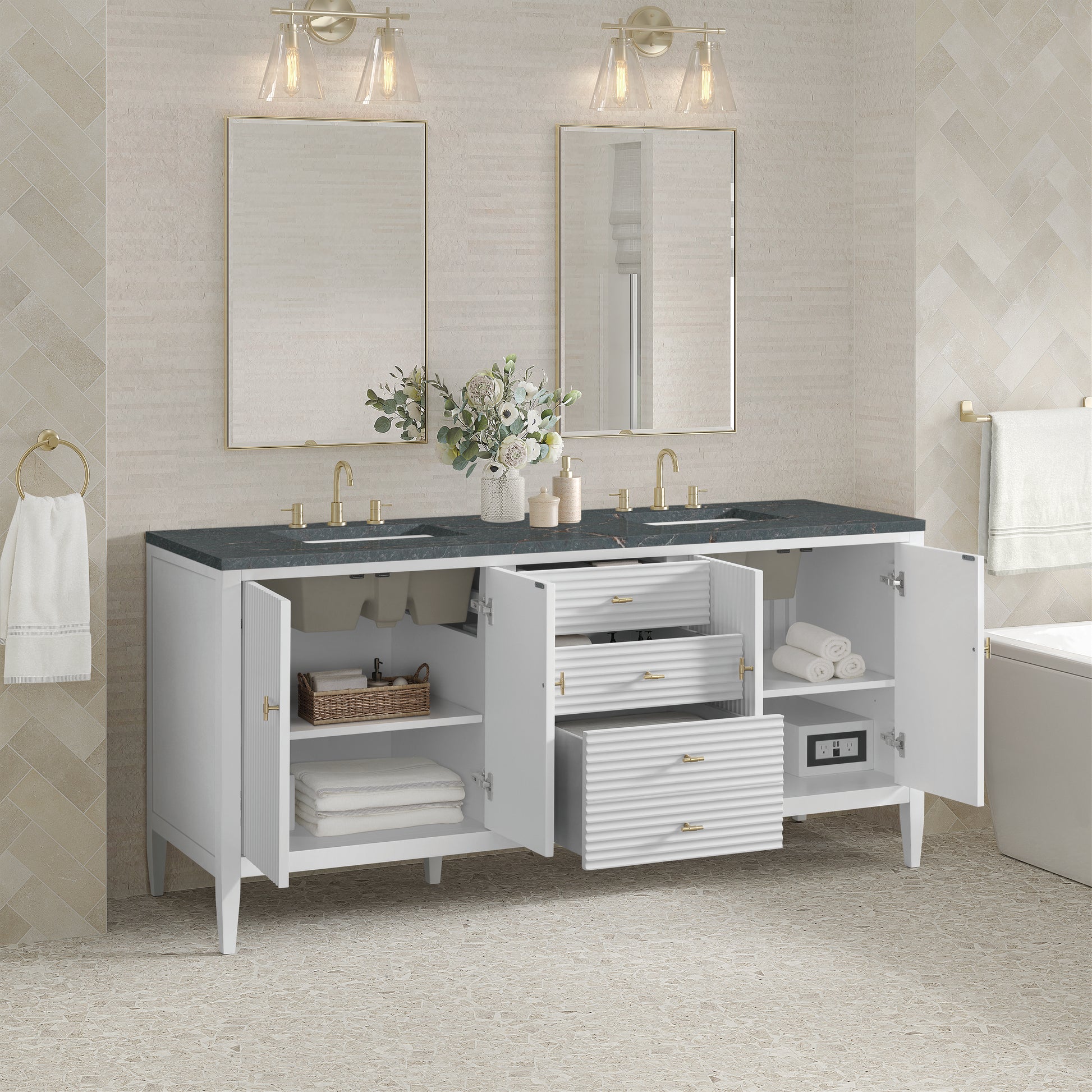 The 72" Myrrin Double Vanity features a minimalistic silhouette with fluted details, resulting in a blend of classical elegance and contemporary design. The deeply fluted panels run perpendicular on the doors and drawers, adding sophistication and visual interest to the design. Toggle-style knobs in Champagne Brass provide a luxe accent to the rich Bright White finish. The four-door cabinet opens to a spacious interior with a single shelf and convenient USB/Electric power outlets. Three drawers lend additional storage. The finish and hardware accents are enhanced by the Parisien Blue Silestone top, offering a deep bluish hue with broad and intricate neutral veins highlighted by fine coppery accents.