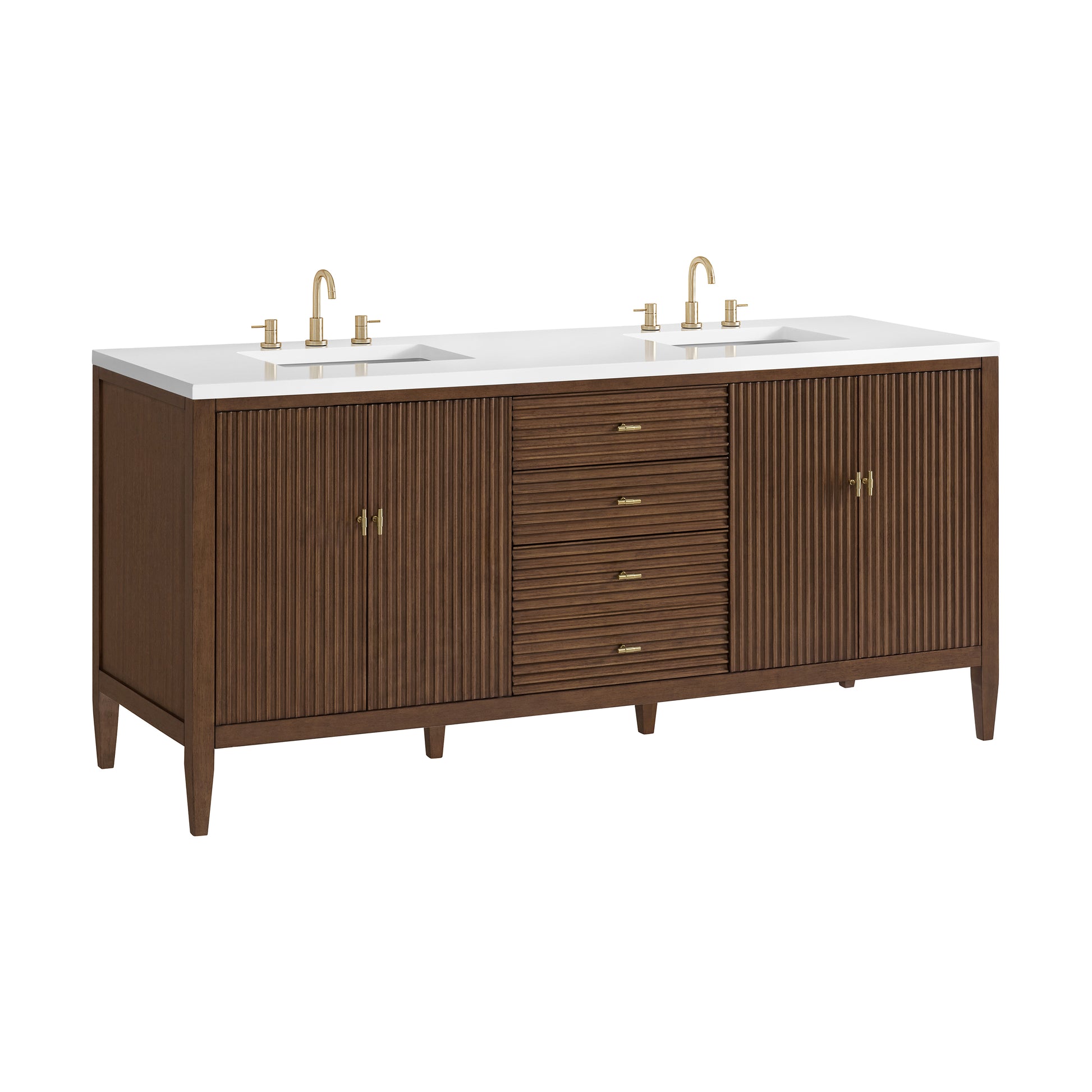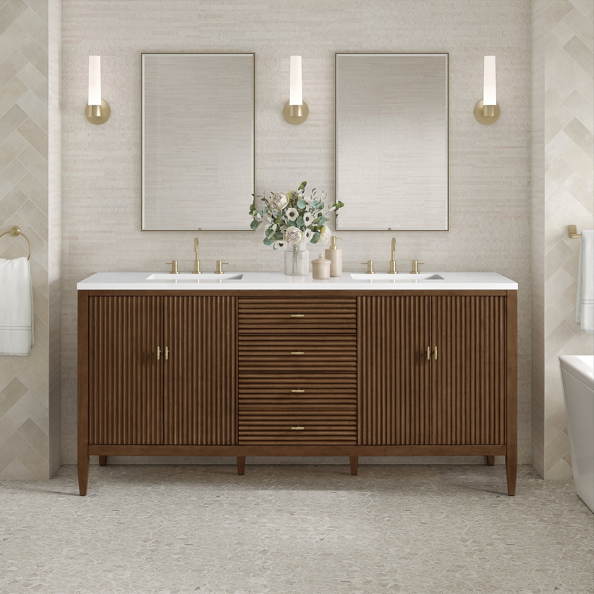 The 72" Myrrin Double Vanity features a minimalistic silhouette with fluted details, resulting in a blend of classical elegance and contemporary design. The deeply fluted panels run perpendicular on the doors and drawers, adding sophistication and visual interest to the design. Toggle-style knobs in Champagne Brass provide a luxe accent to the rich Mid-Century Walnut finish. The four-door cabinet opens to a spacious interior with a single shelf and convenient USB/Electric power outlets. Three drawers lend additional storage. With the addition of a classic White Zeus Silestone top and undermount sink, this vanity is a seamless integration of modern design and functionality.