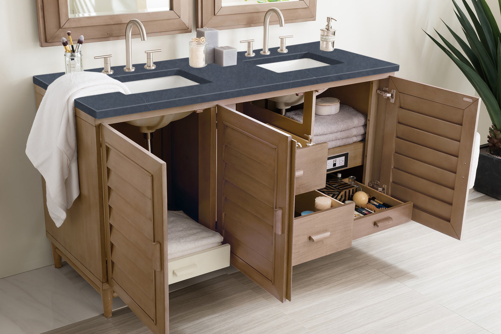 • Three door Whitewashed Walnut double vanity with four interior drawers and shelf space